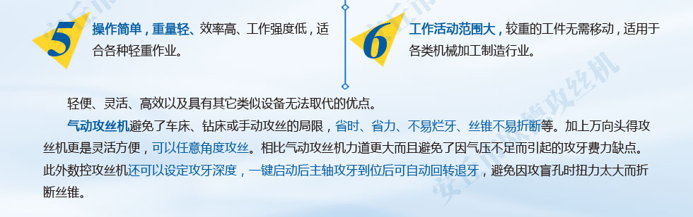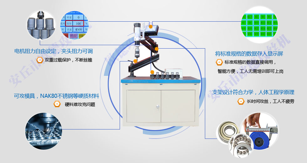 1、微電腦控制,扭矩大小可調,盲孔不斷絲錐:可根據攻絲的大小自行調節扭矩,加上扭力夾頭過載保護,雙重保護,不斷絲錐;主軸在半徑1200/2000MM內任意移動。